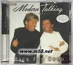 BACK FOR GOOD(m58.net) Modern Talking 是一支德國流行音樂雙人組合,由Thomas Anders和Dieter Bohlen組成。 直到目前為止,Modern Talking在商業(yè)上最成功的德國流行組合。他們的曲調(diào)給人印象深刻,演唱的歌詞則采用英語。 說起80年代的歐式舞曲旋風(fēng),當(dāng)中最具代表性的就非Modern Talking(摩登淘金合唱團(tuán))莫屬了。《Brother Louie》(路易兄弟)是摩登淘金最經(jīng)典的一首歌(也就是港樂《連鎖反應(yīng)》的原曲)。 音樂類型:Euro Disco,Eurodance,Synthpop,Hi-NRG,Italodisco
