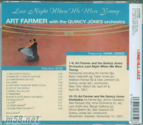 #1-9: "Last Night When We Were Young" Personnel: Art Farmer (tp), Barry Galbraith (g), Hank Jones (p), Addison Farmer (b), Osie Johnson (d), Quincy Jones (arr, cond) plus string orchestra.