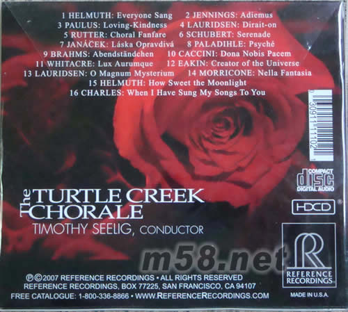 大小龜 男 聲合唱發(fā)燒大碟 HDCD(m58.net) 著名男聲合唱團(tuán)——龜溪合唱團(tuán)(The Turtle Creek Chorale)的發(fā)燒大碟《小夜曲 》(Serenade),是RR公司2007年發(fā)行的專輯。此碟無(wú)比寬闊的音場(chǎng)和精確的人聲定位,帶給你頂級(jí)的人聲合唱享受。 《小夜曲 》(Serenade)由RR錄音大師基思?約翰遜博士錄制于達(dá)拉斯的梅爾森交響音樂(lè)廳,不論從音樂(lè)方面,還是音響效果方面,注定是RR公司最受矚目的唱片之一。