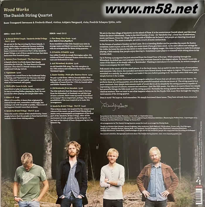 木的藝術品 WOOD WORKS 黑膠(m58.net) 留聲機雜志盛贊:以現代的編排演繹傳統北歐民歌另有一種獨特的優雅氣氛。此專輯以全北歐民族歌曲為主題,樂曲當中亦有波卡舞曲、愛爾蘭吉格舞曲和圓舞曲,使人有聞歌起舞的感覺,180克33轉黑膠以最完全的面貌呈現最有水準的美樂。
