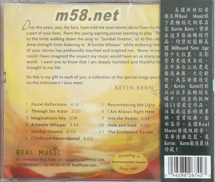 ENCHANTED PIANO 鋼琴名曲選 新世紀純音樂(m58.net) 本專輯REAL唱片公司官方試聽網址:片段http://www.realmusic.com/shop/enchanted-piano.html 美國Real Music(真音樂)暢銷之鋼琴名家Kevin Kern(凱文·科恩),親自精挑細選11首最愛作品,結集成這張精選專輯,首首經典全部落齊。美國Real Music(真音樂)發燒級錄音,是樂迷最佳珍珠。