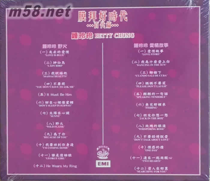 1. 張露( A)- 膜拜好時代 disc1.張露 An Evening with Chang Loo / disc2.張露 蘋果花 (2in1CDset) 8888603 2. 張露( A)- 張露之歌(花嫁) 扇舞 [膜拜好時代之百代篇] 8860880 3. 姚莉( A)- 膜拜好時代 雪人不見了 / 姚莉之歌.歌迷小姐 (2in1CDset) 8888318 4. 姚莉( A)- 那個不關(guān)心 琵琶記 ( 膜拜好時代 2IN1: 百代篇 ) 8888841 5. 潘秀瓊( A)- 潘秀瓊 Poon Sow Keng/ 柔情萬縷 [膜拜好時代之百代篇] 8888606 6. 潘迪華( A)- 給我一杯愛的咖啡 / 男歡女愛 (2in1CDset) 膜拜好時代 8888333 7. 劉韻( A)- 膜拜好時代 穿短裙的小姐 / 知道不知道 (2in1CDset) 8888330 8. 靜婷( A)- 江山美人 / 傾國傾城 [膜拜好時代之百代篇] 8888748 9. 靜婷( A)- 膜拜好時代 電影歌選 / 癡癡地等 (2in1CDset) 8888327 10. 葛蘭( A)- 野玫瑰之戀 教我如何不想她 ( 膜拜好時代 2IN1: 百代篇 ) 8888899 11. 葛蘭( A)- 膜拜好時代 星星月亮太陽 (2in1CDset) 8888324 12. 方逸華( A)- 膜拜好時代 disc1.方逸華 中西名曲 / disc2.方逸華 與西班牙旋律 (2in1CDset) 8888609 13. 鄧麗君( A)- 鄧麗君/ 群星 歌迷小姐 [膜拜好時代之百代篇] 8860888 14. 陳芬蘭( A)- 親愛的母親 / 陳芬蘭與流行歌曲 [膜拜好時代之百代篇] 8860885 15. EMI百代群星( A)- 鐘玲玲野火 / 愛情故事 [膜拜好時代之百代篇] 8888720 16. EMI百代群星( A)- 葉楓 桃李爭春 / 魂牽舊夢 [膜拜好時代之百代篇] 8888612 17. EMI百代群星( A)- 膜拜好時代 disc1.崔萍 心聲弦韻 / disc2.崔萍 雨夜的街燈 (2in1CDset) 8888637 18. EMI百代群星( A)- 黃昏放牛 一片青青的草地 舒云歌集 [膜拜好時代之百代篇] 8861007 19. EMI百代群星( A)- 龔秋霞/ 白虹 秋水伊人/ 醉人的口紅 [膜拜好時代之百代篇] 8860891 20. EMI百代群星( A)- 白光 / 梁萍 BAI KWONG / LIANG PING 秋夜 / 昭君怨 ( 膜拜好時代 2IN1: 百代篇 ) 8888785