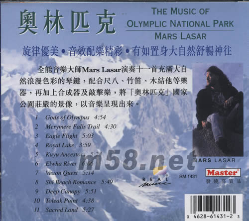 奧林匹克THE OLYMPIC NATIONAL PARKS SERIES 新世紀純音樂(m58.net) 奧林匹克 THE NATIONAL PARKS SERIES 美國國家公園系列專輯 美國國家公園專輯之四大自然浪漫色彩琴鍵、樂手多種電子樂器配合《奧林匹克》的景象,音樂氣魄宏大 旋律優美·音效配樂精彩·有如置身大自然舒暢神往 全能音樂大師MARS LASAR演奏十一首充滿大自然浪漫色彩的琴鍵,配合尺八、竹笛、木結他等樂器,再加上合成器及敲擊樂,將《奧林匹克》國家公園莊嚴的影像,以音樂呈現出來。
