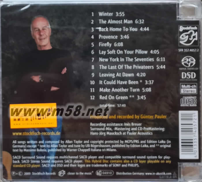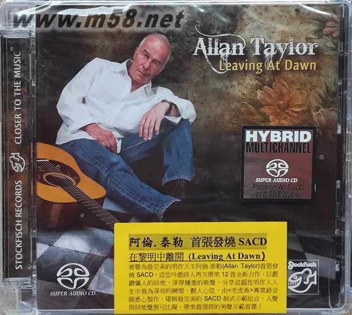 阿倫 泰勒 Leaving at Dawn 在黎明中離開 SACD(m58.net) 阿倫泰勒首張發燒SACD 被譽為最完美的唱作天王阿倫.泰勒(Allan Taylor)首張發燒SACD專輯[在黎明中離開(Leaving At Dawn)],這位吟游詩人再次帶來12首全新力作,以鏗鏘懾人的結他、淳厚穩重的歌聲與你回顧他所懷念的地方、時刻、故事、經歷時代的風霜等,分享這感性唱作人人生中最為深刻的瞬間,醉人心弦。由<老虎魚>專業錄音師悉心制作,堪稱最完美的SACD制式示范組合,人聲與結他聲無可比擬,帶來最頂班的男聲示范首選!特別推薦:[為你而歸家(Back Home To You)]、[螢火蟲(Firefly)]、[70年代的紐約(New York In The Seventies)]、[在黎明中離開(Leaving At Dawn)]及[翠綠上的嫣紅(Red On Green)]等。