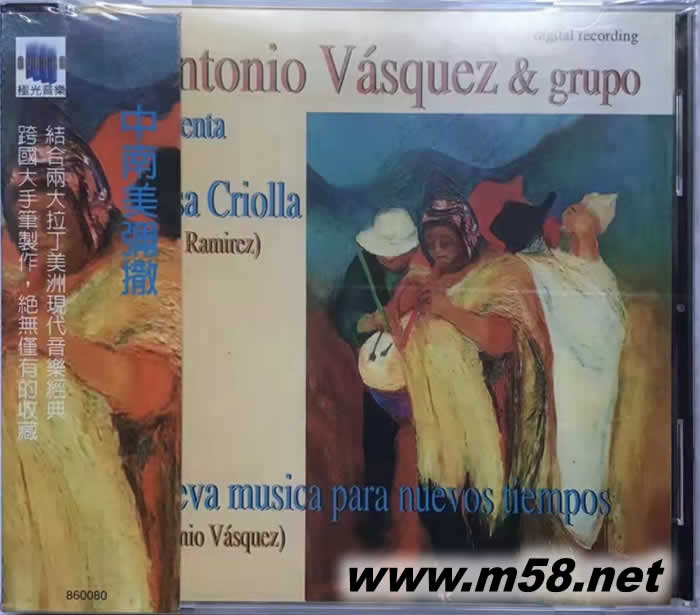 中南美彌撒 Antonio Vasquez Misa Criolla(m58.net) Ramirez 的大作中美洲彌撒,以大量拉丁美洲的樂器及旋律來表現宗教音樂,問世以來受到無數樂迷喜愛,唱片熱賣數百萬張,連流行專輯都望塵莫及。流著拉丁血液的作曲家與吉他手Antonio Vasquez在此自彈自唱,與多國一流樂手及歌者合作,演出成績令人刮目相看,絲毫不讓卡烈拉斯的版本專美於前。另一首作品「現代新音樂」則是Antonio根據聶魯達等智利著名詩人的作品譜寫而成,拉丁人的愛恨情愁躍然於音符之上,實為不可多得的佳作,極光音樂真誠推薦。