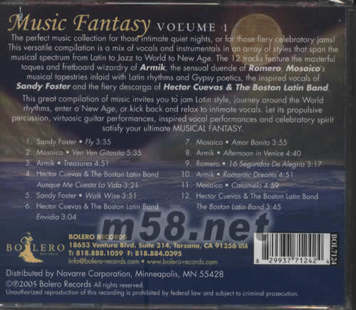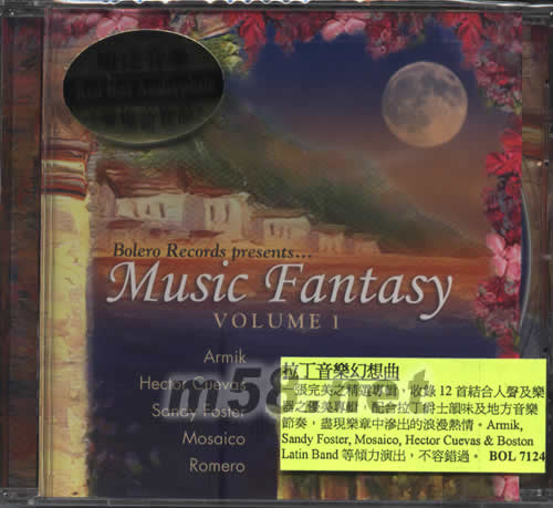 拉丁音樂幻想曲(m58.net) 拉丁音樂幻想曲 一張完美之精選專輯,收錄取2首結合人聲及樂器之優美專輯,配合拉丁爵士韻味及地方音樂節奏,盡現樂章中滲出的浪漫熱情。ARMIK,SANDY FOSTER,MOSAICO,HECTOR CUEVAS & BOSTON LATIN BAND 等傾力演出,不容錯過。 BOL 7124