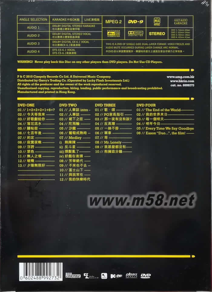 DUO 陳奕迅2010演唱會LIVE Karaoke 4DVD(m58.net) 只有一種封面,演唱版。不可挑選 實力演繹: 好歌獻給你/ 約定/ 囍帖街/ 禁色/ 破曉/ 熱辣辣/ 反斗星/ 頭發(fā)亂了/ 好戲在後頭/ 芳華絕代 特別獻唱: 日文版 Mr.Lonely 二種封面隨機發(fā)貨