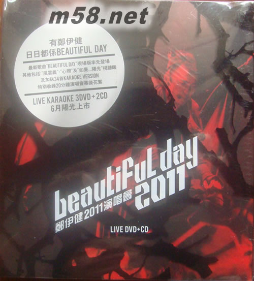 2011演唱會 BEAUTIFUL DAY LIVE KARAOKE 3DVD +2CD(m58.net) 鄭伊健繼2009年睽違紅館舞臺11年舉演唱會,2011年3月一連三場《Beautiful Day 2011演唱會》再續友情歲月。由好拍擋陳光榮擔當音樂總監,舞臺以一顆大樹的立體設計,伊健以五個造型現身,謝安琪、周柏豪和馮曦妤擔任表演嘉賓。 在香港樂壇出道近廿年,當晚伊健大唱的30首本名曲和個唱主題曲「Beautiful Day」,并高唱其他歌手的好歌包括「友共情」、「我的驕傲」等。表演方面,他跟中國巴西 混血模特兒馬瑙(Kate)大跳辣身舞,又把初出道飲品廣告再次搬上舞臺,由師妹馮曦妤唱出廣告歌「如果..陽光」,為觀眾帶來集體回憶的驚喜。伊健獲熱情的歌迷支持,四度安哥一度眼紅哽咽, 唱出「我的歌」時更忍不住男兒淚。 首批限量珍藏版卡拉OK Live 3-DVD特別收錄20分鐘演唱會幕后花絮,另送現場雙CD,精美燙膠封套包裝,限量發行。