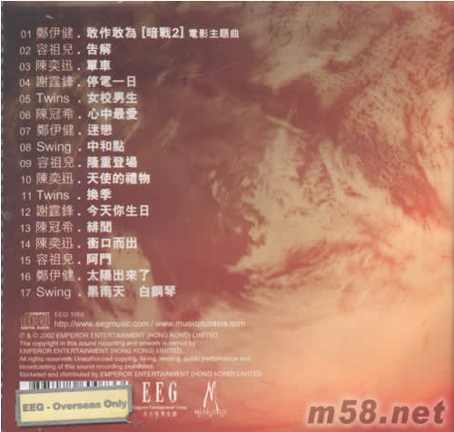 1、敢做敢為/[暗戰2]電影主題曲/鄭伊健 2、告解/容祖兒 3、單車/陳奕迅 4、停電一日/謝霆鋒 5、發校男生/TWINS 6、心中最愛/陳冠希 7、迷戀/鄭伊健 8、中和點/SWING 9、隆重登場/容祖兒 10、天使的禮物/陳奕迅 11、換季/TWINS 12、今天是你的生日/謝霆鋒 13、緋聞/陳冠希 14、沖口而出/陳奕迅 15、阿門/容祖兒 16、太陽出來了/鄭伊健 17、黑雨天 白鋼琴/SWING
