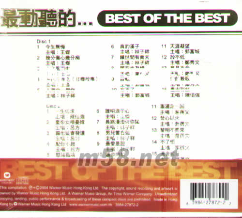 DISC 1 1、今生無悔/王杰 2、幾分傷心幾分癡/王杰 3、人在風(fēng)雨中/王杰 4、梅花三弄之(紅塵故事)/王杰 5、人海中一個你/林子祥 6、真的漢子/林子祥 7、愿世間有青天/林子祥 8、愿死也為情/葉倩文 9、脫軌/郭富城 10、忘不了/郭富城 11、天涯凝望/郭富城 12、放不低/鄭秀文 13、意見不合/鄭秀文 14、愛的挽歌 15、畫出彩虹/陳百強(qiáng)