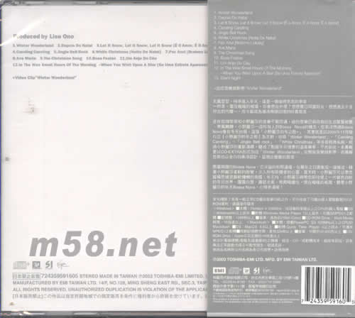 小野麗莎的冬之歌十(m58.net) 北風(fēng)瑟瑟,時(shí)序進(jìn)入冬天,這是一個(gè)值得思念的季節(jié) 一杯茶,窩在暖暖的被窩,你會想些什么呢?想想舊日同窗好友,想想過去辛苦付 出的代價(jià)……而今都成為增添無限回憶的珍貴扉頁。 走在街頭常常和小野麗莎的音樂不期而遇,她的音樂已與你我的生活緊緊相系。寒風(fēng)颼颼 ,小野麗莎一改所有人對BOSSA NOVA 的概念,從來沒想過BOSSA NOVA 會在冬天出現(xiàn), 這張《小野麗莎的冬之歌》為主干,收錄WINTER WONDERLAND 、CAROLING CAROLING、 JINGLE BELL ROCK 、WHITE CHRISTMAS 等多首經(jīng)典名曲,經(jīng)過小野現(xiàn)莎的重新演繹, 變成了點(diǎn)綴冬日情景的溫柔樂章,不光如此,本專輯更以CD-EXTRA 形式加收,WINTER WONDERLAND 完整版音樂錄影帶,而專輯包裝也以全白的素凈設(shè)計(jì),呈現(xiàn)出優(yōu)雅的感覺 原屬南國的BOSSA NOVA ,它洋溢的和熙溫暖,在冬日匯成一道暖流,隨著小野麗莎柔軟的歌聲,注入所有聆聽者的心靈,夏天時(shí),小野麗莎可能帶您縱橫思緒至松軟慵懶的南國 冬天時(shí),小野麗莎帶您前往坡上一片銀色白紗的冬日世界,露露白雪,蕭瑟北風(fēng), ,窩在暖暖的被窩,聽著小野麗莎的冬天BOSSA NOVA ,心情多溫暖