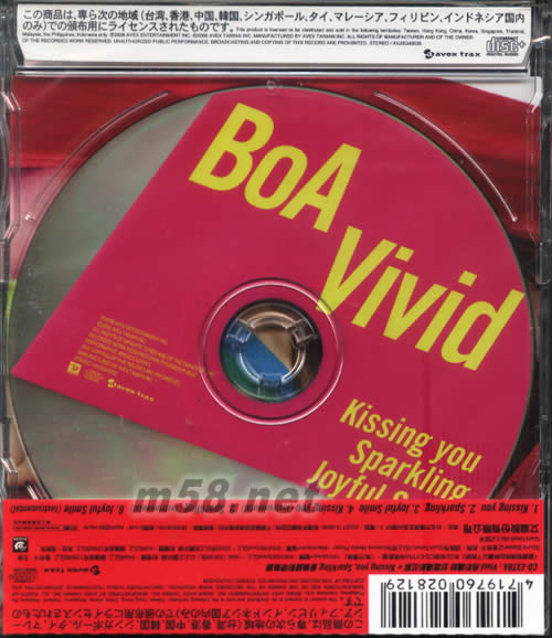 VIVID 亮彩繽紛 KISSING YOU SPARKILING JOYFUL SMILE CD臺灣初回版(m58.net) BoA寶兒全新概念單曲--「Vivid亮彩繽紛 -Kissing you,Sparkling,Joyful Smile-」。以「鮮明、爽快、活力」為主題,從封面至選曲,音樂錄影帶以完整概念呈現,視覺&聽覺皆精彩奪目的全新單曲!!曲風輕快且摩登的「Kissing you」;「Sparkling」則為活力鮮明的浩室曲風,以及令人揪心的R&B樂曲「Joyful Smile」,三首風格迥異的新曲一口氣收錄。「Kissing you」收錄為日劇「7人女律師」主題曲。「Sparkling」收錄為Zespri「黃金奇異果」電視廣告曲。同時發行CD+DVD、以及CD ONLY版。CD ONLY初回版為CD-EXTRA式樣:收錄Vivid亮彩繽紛 封面攝影花絮+Kissing you & Sparklinge 音樂錄影帶集錦。