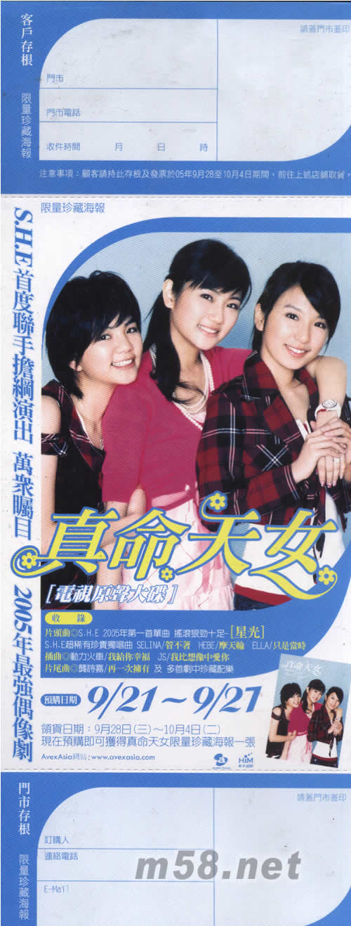 價(jià)格為估,以實(shí)到貨為準(zhǔn)! 真命天女原聲大碟(首批限量海報(bào)版)(m58.net) 首批超豪華精裝版附贈(zèng) SHE限量珍藏雷射精印海報(bào)一張 海報(bào)大小:59*42CM