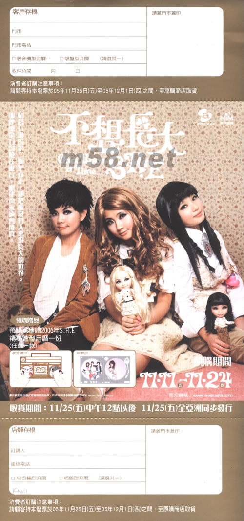 預(yù)購就有機(jī)會(huì)!獲得幸運(yùn)大禮! 以下四位顧客獲得SHE《時(shí)光日記薄》各一本(隨碟寄) 51122011 51110041 51110047 51114039 以下四位顧客獲得《不想長大預(yù)購原版海報(bào)》各一張(海報(bào)筒單寄,普通包裹) http://m.qdshxd.com/ProductDetail.asp?Product_Id=630499320 51121001 51114023 51112021 51111049