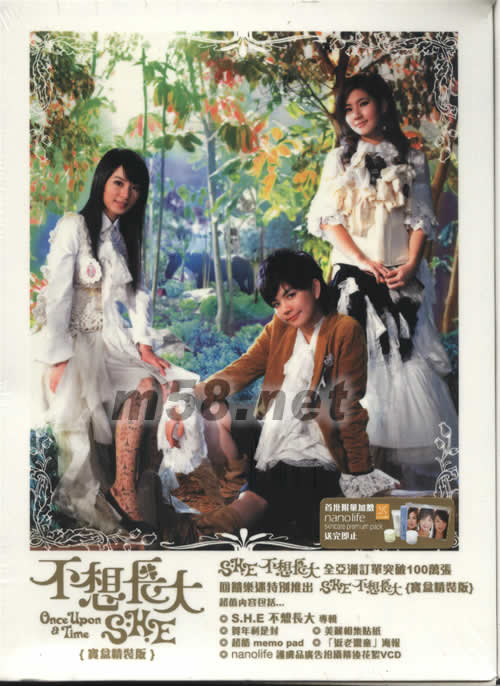不想長大(限量寶盒精裝版)(m58.net) 尺寸:20.5*15.5*4.2CM 回饋樂迷特別推出SHE(寶盒精裝版) 超值內(nèi)容贈: *賀年利是封 *美麗相集貼紙 *超酷MEMO PAD *返老還童海報 NANOLIFE TVC拍攝花絮VCD 首批限量加贈 NANOLIFE SKINCARE PREMIUM PACK 送完即止
