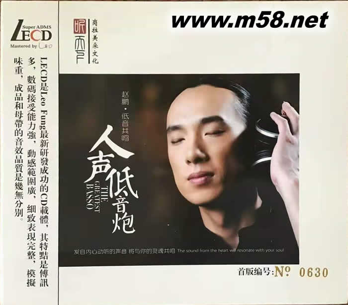 人聲低音炮 LECD 限量版(m58.net) 發自內心動聽的聲音,將與你的靈魂共鳴…… HI-FI發燒世界唯一天地人震撼共鳴天碟, “鵬”湃情感肆意,低頻風暴無敵 臻藏獨有不容錯過、頂級班底白金打造, 大師級編配錄音,縱橫四海精煉名曲 “鵬”誠萬里演繹專屬真韻味。