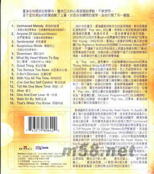 價格為估,以實到貨為準! What My Heart Wants To Say 我心深處(m58.net) 當歌聲可以感動一切時,言語 就不在重要 不畏語言障疑贏得英國電視臺上最大企創一2002POP IDOI新秀選拔賽亞軍歌手最激情勝出! 以3周冠軍曲“UNCHAINED MEIODY奔放的旋律”創下金氏世界紀錄最年青個人冠軍 得主 英國當紅平民小天王,已締造“UNCHAINED MELODY 的旋律”、“ANYONE OF US(STUPID MISTAKE)我們都會出錯”,“SUSPICIOUS MINDS猜疑的心”三首英國金榜軍曲,“WHAT MY HEART WANTS TO SAY我心深處”TOP5暢銷曲及4座SMASH HITS獎之首張英國金榜亞軍專輯