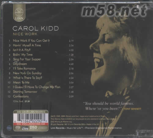 Carol Kidd卡羅爾姐姐被譽為英國最佳女歌手,她有著豐富的演唱經(jīng)驗和成熟的智慧,對于歌曲的駕馭度相當(dāng)高,她在著名的音響名牌LINN旗下灌錄的幾張專輯深受發(fā)燒友的推崇。