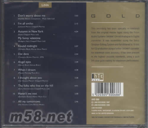 價格為估,以實到貨為準! ALL MY TOMORROWS 24KT GOLD(m58.net) Carol Kidd卡羅爾姐姐被譽為英國最佳女歌手,她有著豐富的演唱經(jīng)驗和成熟的智慧,對于歌曲的駕馭度相當高,她在著名的音響名牌LINN旗下灌錄的幾張專輯深受發(fā)燒友的推崇。 卡羅爾的音樂風格呈多樣化,爵士、流行、民謠均有涉足,LINN從她以往的專輯中挑選出精彩的曲目,推出了這張黃金CD精選輯。她的唱腔輕柔美妙,無論唱哪種類型的歌曲,都能輕易俘獲聽眾的心靈,親和力極強。