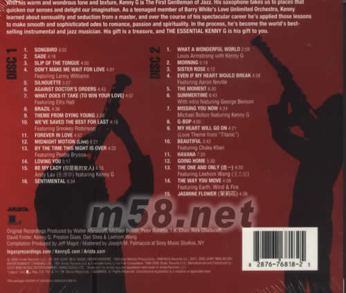 KENNY G Best(m58.net) 譽為世界頂級Saxophone高手 最新雙CD精選 收錄31首出道至今最精彩作品 特別收錄兩首合作作品:王力宏(唯一)/劉德華(你是我的女人) 2CD限量金碟版