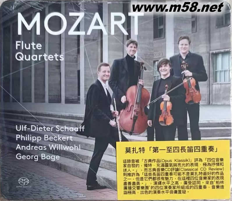 莫扎特 [第一至四長笛四重奏] Mozart: Flute Quartets Nos. 1-4 SACD(m58.net) Ulf-Dieter Schaaff (flute)、 Philipp Beckert (violin)、 Andreas Willwohl (viola)、 Georg Boge (violincello) 1. 莫扎特的長笛四重奏作品精致優雅,輕快生動,迷人得令人難以抗拒,在他的室內音樂作品范疇佔有頗為重要的地位,是古典音樂的雋永小品。 2. 來自柏林廣播交響樂團(Rundfunk-Sinfonieorchester Berlin)的首席長笛演奏家烏爾夫-迪特‧沙夫(Ulf-Dieter Schaaff)聯同其團友小提琴家菲利普•貝克特(Philipp Beckert),中提琴家安德烈亞斯.威爾(Andreas Willwohl)及大提琴家喬治•波格(Georg Boge)所組成的四重奏,音樂造詣極高,出色的演奏水平毋庸置疑。 3. 四位音樂家採用一個非常規的座位安排,長笛與小提琴在外側,中提琴與大提琴在內,這樣令四種樂器能創造出一種新穎的空間效果,音場較為立體平衡,音質更為鮮明,層次分眀。 4. 這錄音被「古典作品(Opus Klassik)」評為"四位音樂家自發的,獨特、充滿靈氣與亮光的表現、極為抒情和迷人。"而古典音樂CD評論(Classical CD Review)則推許為"這些長笛四重奏可能不是莫扎特最好的作品之一,但是它們都很有魅力,在這里四位音樂家的表現盡善盡美。",演繹水平之高,廣受認同。