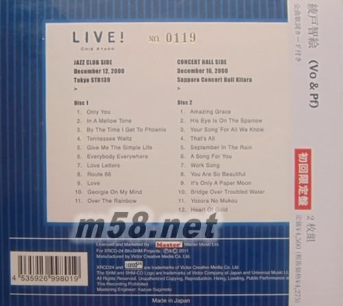 多年來被日本多個音樂媒體視為試音寶碟,爵士天后綾戶智繪雙CD現場專輯,感受兩個不同環境的現場氣氛。JVC以XRCD24BIT 重新混 音,配合SHMCD的液晶透射技術如現場。