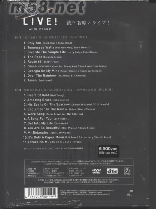 價(jià)格為估,以實(shí)到貨為準(zhǔn)! 綾戶智繪演唱會(huì)LIVE DVD DTS版(m58.net) 詳情參數(shù)請(qǐng)點(diǎn)看產(chǎn)品正、背面大圖 雙DVD套裝分別收錄日本爵士鋼琴女歌手綾戶智繪的兩場(chǎng)演唱會(huì)全部收錄.DISC 1的JAZZ CLUB演唱會(huì)收錄9首作品,全部自彈自唱,瀟灑豪邁,亦充份發(fā)揮其唱功及彈奏技巧。 DISC 2的CONCERT HALL演唱會(huì)收錄11首作品連同大批樂手伴奏,充分發(fā)揮其天衣無縫的合作性,精彩動(dòng)聽! DTS 5.1CH