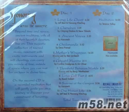 1. Long Life Chant 6:34 (by Jeff Beal & Nawang Khechog) 2. Chendren 5:29 (by Chöying Drolma & Steve Tibbetts) 3. Ancient Voices 5:20 (by Karunesh) 4. Chidananda 5:52 (by Deva Premal) 5. Mother’s Wingspan 14:35 (by Ben Leinbach) 6. Ga¯yatri¯ Mantra 3:11 (by Cynthia Snodgrass & Jim Oliver) 7. Threshold Between Worlds 5:59 (by Benjy Wertheimer) 8. Lotus Call Part 2 4:05 (by Buedi Siebert) 9. Sunrise at the Ganges 5:56 (by Karunesh) 10. One Human Life 2:56 (by Jeff Beal & Nawang Khechog) TOTAL TIME 59:55 Disk Two Track Listing: Meditation by Terence Yallop 16:00