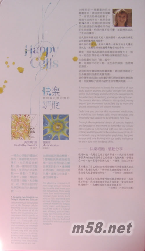 快樂(lè)細(xì)胞(m58.net) 當(dāng)我看起來(lái)什么也沒(méi)在做時(shí)…… 我的細(xì)胞正在快樂(lè)地跳舞!——娜娃妮塔 快樂(lè)細(xì)胞 動(dòng)與靜之間的舞蹈 快樂(lè)細(xì)胞 動(dòng)與靜之間的舞蹈〔英文導(dǎo)引版〕 回到「身體」,你便進(jìn)入了智慧與療癒的源頭。 生命,以及我們對(duì)生命的感知都是透過(guò)移動(dòng)。這個(gè)身體本身就是移動(dòng),細(xì)胞、分子、體液……,都以一種整體的方式在共舞著。《快樂(lè)細(xì)胞》是一場(chǎng)身心移動(dòng)的體驗(yàn)式旅程,隨著娜娃妮塔的導(dǎo)引,你只需要放輕鬆,用一種對(duì)你而言是愉悅、享受的方式來(lái)移動(dòng)——移動(dòng),了解自然產(chǎn)生;移動(dòng),奧秘自然呈現(xiàn);移動(dòng),和身體在一起,像孩子般好好地享受和自己共舞的游戲……。 快樂(lè)細(xì)胞 動(dòng)與靜之間的舞蹈〔音樂(lè)版〕 這輯由娜娃妮塔親自精選、9首舞動(dòng)快樂(lè)細(xì)胞的音樂(lè),來(lái)自九位世界知名心靈音樂(lè)家的創(chuàng)作,包括勇奪新世界音樂(lè)排行榜的首席感性女聲Deva Premal,以及暢銷世界15萬(wàn)張的心靈金曲。 每一首音樂(lè)都充滿了獨(dú)特的祝福和舞動(dòng)的能量,在動(dòng)與靜的節(jié)奏之間,自然觸動(dòng)身體,讓你自由地享受身體的純真,與細(xì)胞快樂(lè)共舞,讓身心充滿愛(ài)、喜悅與寧?kù)o。 華人地區(qū)超值加贈(zèng) 中文翻譯版導(dǎo)引CD 內(nèi)附中英文導(dǎo)聆手冊(cè) 吸氣進(jìn)來(lái),我感覺(jué)我的身體。 呼氣出去,我微笑。 20年前的一場(chǎng)嚴(yán)重的巴士翻覆意外,娜娃妮塔的腿斷了、背部及肋骨也都斷了,經(jīng)過(guò)七次的手術(shù),依然全身動(dòng)彈不得;但娜娃妮塔卻發(fā)現(xiàn)在她破敗的身體中所存在的生命能量,仍保持著不受打擾,並且轉(zhuǎn)而成為了生命的慶祝。 當(dāng)我整個(gè)身體被固定的只能躺著時(shí),我的腳指頭還在快樂(lè)的繼續(xù)他們的舞。 我欣喜的發(fā)現(xiàn)到,生命之舞用一種無(wú)言的方式傳達(dá)著訊息,激勵(lì)這個(gè)身體繼續(xù)舞動(dòng)它的生命力。…… 最后,那被視為奇蹟式的痊癒就這樣發(fā)生了。如今,她在世界各地分享舞動(dòng)快樂(lè)細(xì)胞的方法,深受歡迎。 生命能量存在於「動(dòng)」當(dāng)中。 動(dòng),是無(wú)所不在的;動(dòng),是生命的源頭,也是舞的源頭。 透過(guò)細(xì)胞中最細(xì)微的能量舞動(dòng),娜娃妮塔創(chuàng)造了全身癱瘓到痊癒的美麗奇蹟。 當(dāng)你隨著她充滿自由能量的導(dǎo)引開(kāi)始舞動(dòng)快樂(lè)細(xì)胞時(shí),你便舞動(dòng)了源源不絕的生命智慧與奇蹟……。