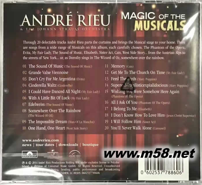 20首歌舞劇經典樂曲,特別收錄「貓」、「真善美」、「歌劇魅影」、「仙履奇緣」、綠野仙蹤」與「窈窕淑女」等歌舞劇名曲演繹。☉安德烈.瑞歐/約翰.史特勞斯管弦樂團 安德烈.瑞歐是位才華洋溢,將古典樂深入淺出的音樂家。他以史特勞斯圓舞曲為根本,並以各種多元型式將管弦樂的優美結合流行、電影、舞臺劇與民謠等音樂型態,提昇音樂欣賞的品味。同時他也是位優秀的作曲家,在2014年最新錄音當中,他自己也譜下一曲圓舞曲「Grande Valse Viennoise」,比美歌舞劇的扣人心弦場景。 這張收錄20首歌舞劇名曲的全新專輯「歌舞劇神采」,特別將最優美的舞臺劇經典旋律與膾炙人口的樂曲,詮釋演奏成輯。包括「真善美」、「仙履奇緣」、「綠野仙蹤」與「窈窕淑女」等,20首樂曲就像是眾多樂迷的浪漫年輕回憶。因為這些歌舞劇大多改編成電影,並獲得廣大樂迷與戲迷的共同記憶。當然「歌劇魅影」與「貓」等劇也曾經數度在臺灣巡演,無論是電影或是歌舞劇愛好者,對這些音樂都有一個美好時光的印象。 安德烈.瑞歐在自己的音樂安排中總呈現一種永恆不變的浪漫情懷,單純的音樂感動正是現代人欠缺的。希望藉著這些音樂,讓樂迷在生活當中找回年輕純真的心靈。