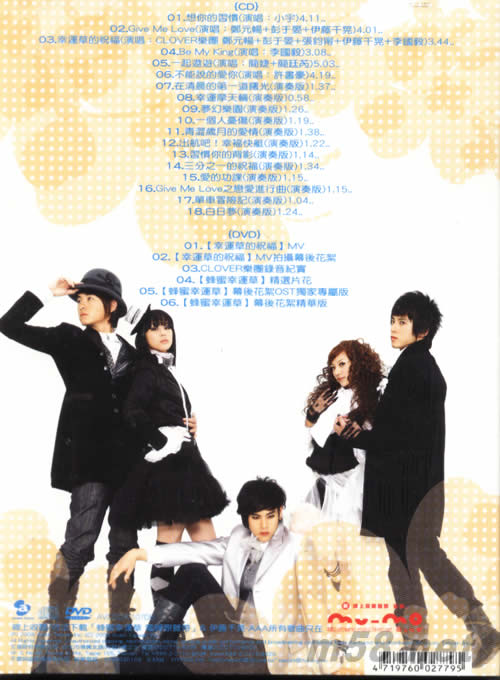 蜂蜜幸運(yùn)草電視原聲帶(夢幻影音版)(m58.net) 改編自日本人氣漫畫,繼日本動(dòng)畫及電影版後,由《人魚朵朵》臺灣導(dǎo)演李蕓嬋執(zhí)導(dǎo),眾青春偶像—《惡作劇2吻》鄭元暢、《基因決定我愛你》彭于晏、《白色巨塔》張鈞甯、《深海》蘇慧倫,以及李國毅、張翰、陳宇凡、歌手蘇見信與日本樂團(tuán)AAA成員伊藤千晃主演這部甜蜜與夢幻的愛情劇《蜂蜜幸運(yùn)草》。劇集把五位在美術(shù)大學(xué)的好友們在深摯友情下發(fā)展的兩段三角關(guān)系,如何面對愛情、友情及未來的故事,2008年搬上華視小銀幕。 適逢這套純真和清新偶像劇即將上畫,劇中主角之一鄭元暢、彭于晏、張鈞甯、伊藤千晃和李國毅還特別藉此機(jī)會(huì)組成史上最強(qiáng)的夢幻樂團(tuán)「CLOVER幸運(yùn)草樂團(tuán)」,且演唱了片頭曲「幸運(yùn)草的祝福」。這是一首青春洋溢和輕快的同樂歌,CLOVER幸運(yùn)草樂團(tuán)成功演繹了最動(dòng)聽的主題曲。碟內(nèi)還有眾演員合唱、由彭于晏Rap的「Give Me Love」,以及2008年度新人小宇的抒情歌「堅(jiān)持著愛你」。 夢幻影音版隨碟還收錄了三首主打歌MV、錄音花絮和劇集制作特輯的DVD。