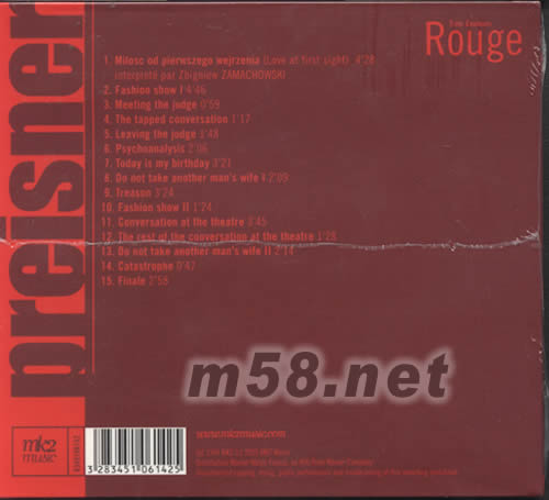 價格為估,以實到貨為準(zhǔn)! TROIS COULEURS ROUGE紅色深情電影原聲(m58.net) Trois Couleurs Rouge《紅色情深》(《藍(lán)•白•紅三色之紅色》)電影原聲OST CD【歐洲法國MK2版CD】 這個是法國MK2 MUSIC公司發(fā)行的最新版,正?。?! Rouge《紅色情深》獲得:1995年第二十屆法國電影藝術(shù)與技術(shù)學(xué)院“愷撒獎”的最佳電影配樂獎。