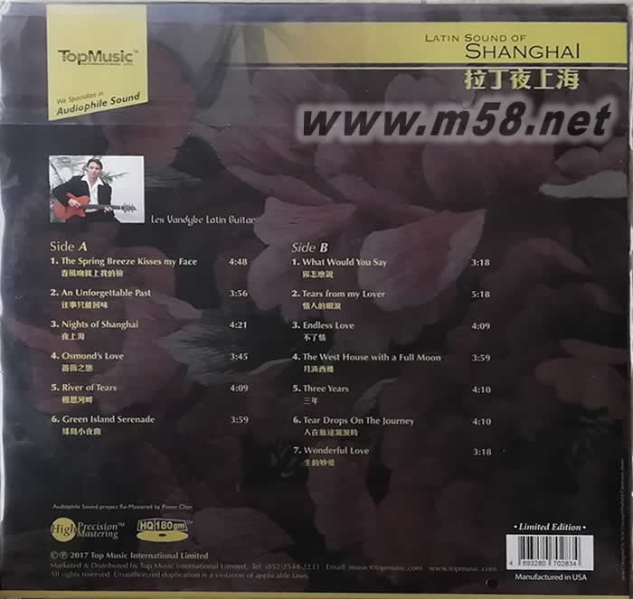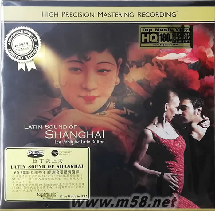 吉它 LATIN SOUND OF SHANGHAI 拉丁夜上海 180g 33RPM LP 黑膠(m58.net) 世界級頂尖拉丁吉他手Lex Vandyke巧手演繹經典國語老歌。 ☆ 拉丁風情與上海外灘情懷共同交織的雋永之作。 ☆ 耳熟能詳的優美旋律、舉重若輕的演奏技巧、質感絕佳的頂級錄音。 ☆ 「黃金合金」材質製作光碟音質更顯不凡! 當熱情洋溢的拉丁旋律遇上了經典國語老歌,到底會擦出什麼樣的火花呢?這個答案就由「拉丁夜上海(Latin Sound Of ShangHai)」來告訴您。 這張專輯由世界級頂尖的拉丁吉他手Lex Vandyke獨挑大樑,其優異的演奏技巧早已透過「拉丁情人」與「情陷地中海」這兩張發燒友競相傳頌的專輯,獲得高度肯定。專輯中共選錄了13首大家耳熟能詳的經典國語老歌,如:「春風吻上我的臉」、「往事只能回味」、「情人的眼淚」、「不了情」、「相思河畔」、「綠島小夜曲」、「月滿西樓」、「三年」…… 等等,經過重新編曲且在Lex Vandyke巧手的演繹之下,您會驚訝的發現,原來以拉丁旋律來演奏這些四○~七○年代的經典國語老歌,居然可以幻化出如此輕鬆、爵士的風情來。上海外灘的燈影、建筑、以及太多的歷史回憶,在此刻似乎都開始隨著琴聲搖擺起拉丁的韻律來。有點昏黃、有點浪漫,或是模糊、或是感傷,這張唱片中有太多地方值得您細細咀嚼品味。 在聲音品質部分,著名的發行公司Top Music採用其特有的 「Premium Alloy Gold」黃金合金材質光碟製作技術和「High Precision Mastering」混音技術;并將全輯送往澳洲製作。吉它的音質音色清晰而悅耳、溫潤且立體,重播效果精準、真確無遺,讓再挑剔的人也找不到任何可以抱怨的空間。