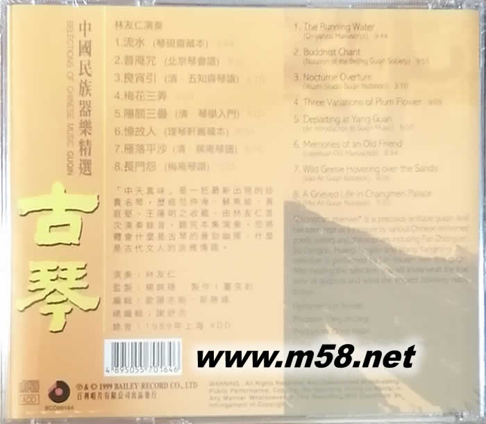 1 流水 (琴硯齋藏本) 9’44’’ The Running Water(Qinyanzai Manuscript) 2 普庵咒 (北京琴會譜) 9’55’’ Buddhist Chant (Notation of the Beijing Guqin Society) 3 良宵引 (清•五知齋琴譜) 3’10’’ Nocturne Overture (Wuzhi Studio Guqin Notation) 4 梅花三弄 9’09’’ Three Variations of Plum Flower 5 陽關三疊 (清 琴學入門) 5’07’’ 6 憶故人 (理琴軒舊藏本) 8’34’’ Memories of an Old Friend (Liqinxuan Old Manuscript) 7 雁落平沙 (清 蕉庵琴譜) 6’26’’ Wild Geese Hovering over the Sands (Jiao An Guqin Notation) 8 長門怨 (梅庵琴譜) 5’23’’ A Grieved Life in Changmen Palace (Mei An Guqin Notation)