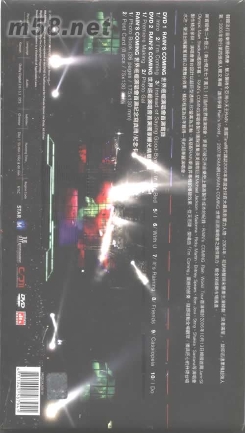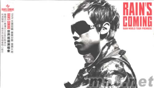 RAIN WORLD TOUR PREMIERE DVD(m58.net) 韓國流行音樂界超級偶像,魅力襲卷全亞洲小天王RAIN,美國TIME時代雜志2006年票選全球百大最具影響力人物.2004年,初試啼聲與宋慧喬主演韓劇"浪漫滿屋",旋即迅速累積超強人氣.2006年發行第四張個人韓文專輯"誰雨爭鋒花石Rain's World",2007年RAIN將以RAIN'S COMING世界巡回演唱會之強悍勢力,朝全球娛樂市場邁進. 耗資韓幣二十億元(新臺幣近七千萬元)打造的世界級演唱會,更是打破亞洲音樂史上最高制作成本的紀錄,RINS'S COMING Rain World Tour 首演場于2006年10月13日韓國首爾Jam-SilOlympic Main Stadium 揭開序幕.RAIN'S COMING 演唱會制作團隊匯集英美國際巨星Michael Jackson、Madonna、Ricky Martin、Britney Spears、Bon Jovi、Sting、Shakira、Santana等演唱會制作精英參與。演唱會舞臺設計以超巨型透明LED熒幕為主軸,再搭配RAIN剩直升專機的爆破效果,從天而降。開場曲“I'm Coming“震憾的節奏,隨即撼動全場觀眾;獨具匠心的升降臺噴水池,營造出絢麗奪目的立體舞臺效果,精彩程序為百年難得一見的超華麗演唱會。