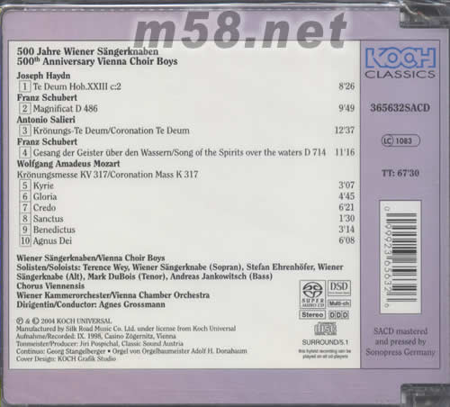 維也納兒童合唱團于1498年成立。在超過半個千禧年對古典音樂的貢獻下孕育出多位舉足輕重的作曲家如莫扎特,海頓,舒伯特及薩列里等。此CD將這500年合唱團的傳世經典作品包括“河上的歌曲與靈魂”及“加冕進行曲”等收錄在這專輯之中。合唱團以純熟演唱技巧,淋漓盡致地演繹這些前輩的曠世之作。