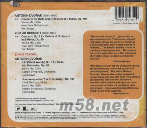 AntonIn dvorak(1841-1904)) 1-3 CONCERTO FOR CELLO AND ORCHESTRA IN B MINOR ,OP.104 YO-YO MA ,CELLO NEW YORK PHIHARMONIC KURT MASUR VICTOR HERBERT(1859-1924) 4-6 CONCERTO NO.2 FOR CELLO AND ORCHESTRA IN E MINOR OP.30 YO-YO MA ,CELLO NEWYORK PHILHARMONIC KURT MASUR BONUS TRACKS: ANTONIN DVORAK 7 KLID(SILENT WOODS )NO.5 FOR CELLO AND ORCHESTRA,OP.68 YO-YO MA CELLO BOSTON SYMPHONY ORCHESTRA SEIJI OZAWA 8 HUORESQUE NO.7 IN G-FLAT MAJOR,OP.101 LTZHAK PERLMAN,VIOLIN YO-YO MA ,CELLO BOSTON SYMPHONY ORCHESTRA SEIJI OZAWA