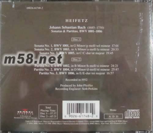 Bach Concerto For Two Violins Heifetz (海飛茲) 和Erick Friedman (弗里德曼) (CD) 2018/4/1