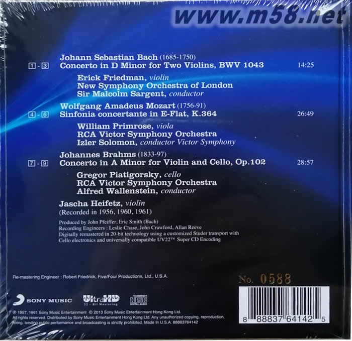 巴赫的「D小調(diào)雙小提琴協(xié)奏曲」、莫札特的「降E大調(diào)協(xié)奏交響曲」、布拉姆斯的「小提琴與中提琴的雙重協(xié)奏曲集」是古典音樂史上zui膾炙人口的三大經(jīng)典協(xié)奏曲」,由海飛茲(Jascha Heifetz,1900-1987)擔(dān)綱演奏, 收在同一張專輯里,實在是發(fā)燒友及樂迷之耳福。雙提琴協(xié)奏曲由Platlgorsky(大提琴)、Primrose(中提琴)、Friedman(小提琴)三位提琴家和海菲茲共同演繹。