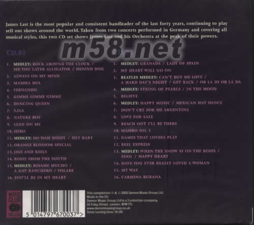 生平介紹:1929年 4月17日出生于德國,19歲時組建了Recker-last合唱團,1955年加入寶麗金旗下的寶麗多唱片公司,并以James Last為樂團名稱。James Last樂團是世界三大輕音樂團之一,善于吸收各種音樂風格,如古典音樂、鄉村音樂、搖滾音樂、拉丁音樂等,同時又致力于各國民族音樂的發掘,被譽為"舞會音樂之王"。其音樂風扉世界樂壇近40年,遍及150個國家,榮獲的獎項不計其數,贏得了17張白金唱片和206張金唱片的驕人紀錄,在全球范圍內銷售唱片逾八千萬張,成為世界樂壇歷史上唱片銷售最多的樂團,James Last本人作為作曲和編曲家亦可謂是世界上最成功的樂團領袖。