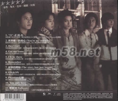 01. "O"-正.反.合. 氣勢萬千的主打熱歌,再次給歌迷S.M.P曲風(SM MUSIC PERFORMANCE)的震撼. 02. 世界唯一的真心 You're my miracle 獻給秋日的主打,美妙溫暖的旋律,加上東方神起的甜蜜合音. 03. Hey! Girl 特別嘗試的性感抒情歌,除了美式R&B旋律外,還加入了爵士樂的伴奏. 04. Get me some 融合HIP HOP 節拍的URBAN風格的舞曲,民現東方神起更加成熟的心思. 05. I'll be there 特別送給歌迷的感謝之歌,在有天與在中的彈指聲中與大家指約定永不分開 06. Remember 由美妙的合直抒己見為開始的這首,是獎R&B的精髓表現到淋離盡致的經典抒情歌. 07.故事的開始 The story has just begun 由韓國實力派作曲家YOON SANG特別為東方神起度身訂做的歌曲,抒情迷人. 08. ON & ON 由美國女歌手MONICA制作人特別度身訂做,是東方神起前所未有過的美式作品 09. Phantom 幻影 東方神起初次嘗試的搖滾曲風 10. You only love 感受東方神起夢幻般的合音變化,每次必定會收錄的 A CAPPELLA合音歌曲 11. 輕氣球 Balloons 重唱80年代韓國的名曲(輕氣球),以東方神起獨有的方式重生.