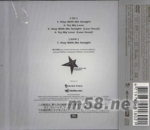 CD 01. Stay With Me Tonight 02. Try My Love 03. Stay With Me Tonight(Less Vocal) 04. Try My Love(Less Vocal) DVD 01. Stay With Me Tonight 東方神起are Yunho(U-Know),Yucheon(Micky) Jejung(HERO),Changmin(MAX),Junsu(Xiah)