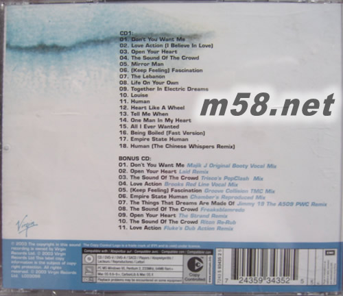 CD 1 01. Don’t You Want Me - 1981, 1982年英美雙料冠軍單曲 02. Love Action (I Believe In Love) - 1981年全英排行季軍單曲 03. Open Your Heart - 1981年全英排行第6名 04. The Sound Of The Crowd - 1981年全英排行Top 12 05. Mirror Man - 1982年全英排行亞軍單曲 06. (Keep Feeling) Fascination - 1983年全英亞軍單曲,全美舞廳播放排行榜冠軍 07. The Lebanon - 1983年全英排行Top 11,全美熱門(mén)舞曲榜Top 20 08. Life On Your Own - 1984年全英排行Top 16 09. Together In Electric Dreams - 1984年《神通情人夢(mèng)》電影插曲 10. Louise - 1984年全英排行Top 13 11. Human - 1986年全美流行榜及舞曲榜雙料冠軍單曲 12. Heart Like A Wheel - 1990年全美現(xiàn)代搖滾榜排行17名 13. Tell Me When - 1995年英美雙料排行Top 10單曲 14. One Man In My Heart - 1995年全英排行Top 13 15. All I Ever Wanted - 2001年最新代表作 16. Being Boiled [Fast Version] - 1978年首支單曲,1982年全英排行第6名 17. Empire State Human - 1980年全英排行62名 18. Human (The Chinese Whispers Remix) - 亞洲版獨(dú)家收錄中文混音曲 BONUS CD 1. Don’t You Want Me Majik J Original Booty Vocal Mix 2. Open Your Heart Laid Remix 3. The Sound Of The Crowd Trisco’s Pop Clash Mix 4. Love Action Brooks Red Line Vocal Mix 5. (Keep Feeling) Fascination Groove Collision TMC Mix 6. Empire State Human Chamber’s Reproduced Mix 7. The Things That Dreams Are Made Of Jimmy 19 The A509 PWC Remix 8. The Sound Of The Crowd Freaksblamredo 9. Open Your Heart The Strand Remix 10. The Sound Of The Crowd Riton Re-Rub 11. Love Action Fluke’s Dub Action Remix