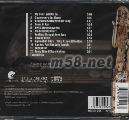 價格為估,以實到貨為準! HI FI SAX(m58.net) 極級音效 格調高雅 LIGHT JAZZ 界SAXOPHONE 手SAM LEVINE 示范12首HIFI XAX當中不乏浪漫激情樂曲,如SOMEWHERE OUT THERE ,I WILL ALWAYS LOVE YOU ,KILLING ME SOFTLY WITH HIS SONG,TEARS OF JOY…… SAM更以高雅手法演繹不落俗套。錄音更屬示范級制作,欣賞指數爆燈之作。
