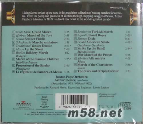 MARCHES IN HI FI(LIVING STEREO 逼真立體聲系列)(m58.net) 指揮家FRITZ RINER生前掌管波士管大從管弦樂(lè)團(tuán)前結(jié)長(zhǎng)達(dá)五十年之久,在非正式演奏季時(shí),額外以演奏通俗古典和跨界樂(lè)曲作為娛樂(lè)功能的樂(lè)團(tuán)。在他成功能經(jīng)營(yíng)和選曲策略下,他讓樂(lè)團(tuán)成為全美最知名、也最受到喜愛(ài)的樂(lè)團(tuán),同時(shí)他們舍作灌錄的唱片,也遠(yuǎn)超過(guò)世上任何的古典、樂(lè)團(tuán),所角售的數(shù)量更超過(guò)五千萬(wàn)張以上。