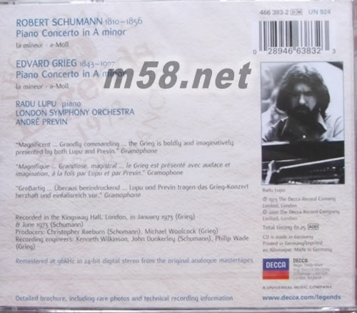 葛利格&舒曼:小調(diào)鋼琴協(xié)奏曲 Grieg/Schumann:Piano Concertos(m58.net) 羅馬尼亞鋼琴家魯普與名指揮普烈文的這套舒曼與葛利格鋼琴協(xié)奏曲唱片,為DECCA歷來(lái)最好的鋼琴錄音之一。錄音地點(diǎn)英國(guó)Kingsway廳本就具有優(yōu)異的音響條件,通透的琴韻與飽滿的管弦樂(lè),加上良好的平衡感,構(gòu)成寬松且不局促、不空蕩的聆樂(lè)感,早年即已高掛美國(guó)TAS發(fā)燒榜單。魯普具備了一般鋼琴家中少見的大膽創(chuàng)意與細(xì)膩詩(shī)情,其慧眼常能窺見樂(lè)曲的深邃內(nèi)涵,舒曼與葛利格的兩首a小調(diào)協(xié)奏曲特有的浪漫性格恒能與魯普的演奏特色相吻合,復(fù)又獲得普烈文與倫敦交響樂(lè)團(tuán)以堅(jiān)實(shí)的管弦音色支撐,使本輯錄音突出,演奏亦時(shí)能令人喜出望外