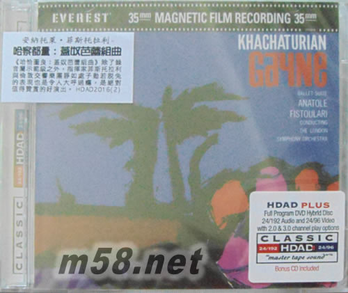 哈察都量 蓋奴芭蕾組曲Khachaturian: Gayne Ballet Suite HDAD(m58.net) What is a 24/96 DVD & 24/192 DVD-A? It is a High Quality 24/96 DVD & 24/192 DVD-A Hybrid Digital Audio Disc (HDAD) (Audio-ONLY DVD!) which features both 24-bit/96kHz and 24-bit/192kHz digital sampling rates. This disc is a two sided DVD based disc. One side of the disc is DVD video formatted and contains 24/96 PCM data playable on all DVD video players. The other side contains 24/192 PCM data and is playable on DVD audio players.