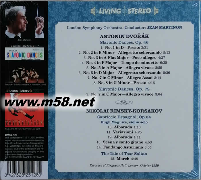 德佛夏克:斯拉夫舞曲,人人都非常熟悉,成曲是採用斯拉夫的傳統舞蹈節奏,充滿了波西米亞民謠風,原本應該是鋼琴四手聯彈,受到布拉姆斯匈牙利舞曲的靈感激發,改成管弦樂版,由Jean Martinon (馬丁農)指揮倫敦交響樂團,RCA Bible 10+,選用原裝黑膠封面,收藏價值更高。附加林姆斯基高沙可夫:西班牙隨想曲,這原是西班牙北部阿斯圖里亞斯地區一種富有活力的舞曲,五個樂章,旋律及配樂音調均是精彩萬分,輕快激昂。