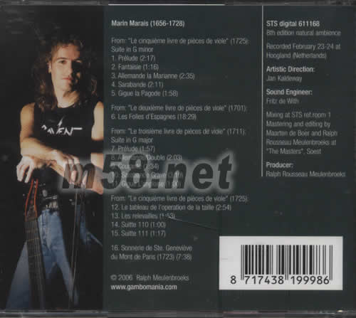 from: "Le deuxième livre de pieces de viole" (1701): 6. Les folies d'Espagnes (complete) from: "Le troisième livre de pièces de viole" (1711): Suite in G major 7. Prelude 8. Allemande/Double 9. Courante 10. Sarabande Grave 11. Gigue l'Angloise from: "Le cinquième livre de pièces de viole" (1725): 12. Le Tableau de l'Operation de la Taille 13. Les Relevailles 14. Suitte 110 15. Suitte 111 16. Sonnerie de Ste. Geneviève du Mont de Paris