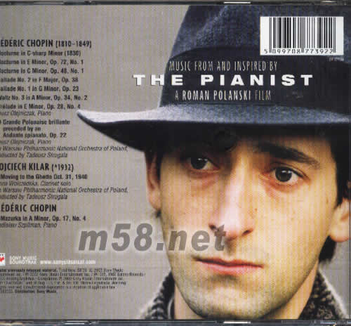 鋼琴家THE PIANIST(m58.net) 本片由「黛絲姑娘」、「驚狂記」、「鬼上門」等片揚名國際影壇的法國名導羅曼波蘭斯基執導,「化妝師」金獎提名編劇家Ronald Harwood改編。音樂配樂是由「吸血鬼」、「伴我一世情」(The Portrait Of A Lady)之波蘭音樂家Wojciech Kilar為電影所作的原著音樂,同時還選錄70年代於華沙國際蕭邦鋼琴大賽贏得大獎的波蘭鋼琴家Janusz Olejniczak演繹八段蕭邦的樂章,更不能不提的是,在專輯中彌足珍貴的收錄了故事中主角Szpilman本人在1948年於波蘭親自演奏蕭邦的馬厝卡舞曲 (Mazurka)第17號第4段樂曲的歷史錄音。